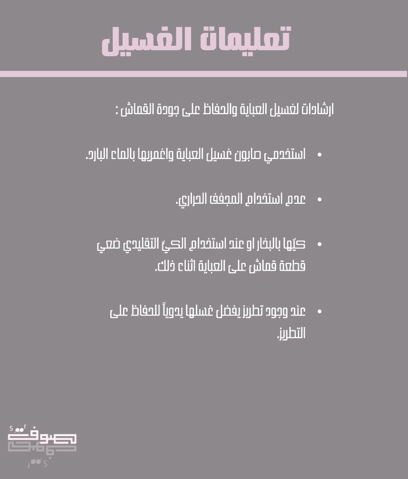 - ننصح بكيها باستخدام البخار للحفاظ على نعومة القماش.