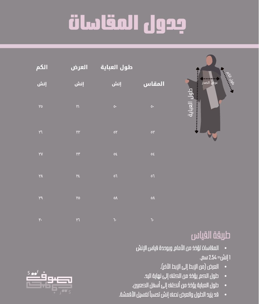 - طول العباية يؤخذ من الكتف إلى أسفل الكعبين.